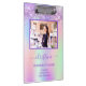 Un arrière - plan tendance irisé aux couleurs pastel unicorne et arc-en-ciel rose, violet, or rose, vert menthe. Décoré avec de la poussière de parties scintillant imitation. Un porte - bloc pour les maquilleurs, les designers de cheveux, les salons de coiffure et de beauté. Lettres violettes. Personnalisez et ajoutez une photo, votre nom et vos coordonnées. Le nom personnel est écrit avec un script de style moderne écrit à la main avec des swashes. Pour que les swashes ne suppriment que le nom de l'échantillon, laissez les espaces ou émoticônes devant et après le nom. Supprimer si non voulu.