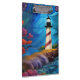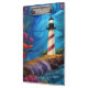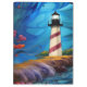 Beau phare rayé rouge et blanc sur une rocheuse surélevée entourée de fleurs et bleu eau/ciel IA Art créé par minx267