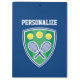 Porte - bloc personnalisé de court de tennis pour l'entraîneur professionnel. Ajoutez votre propre nom, logo, nom d'équipe ou nom fait sur commande de club. Idée gentille de cadeau d'anniversaire pour le High School Coach, le joueur, la maman, le papa, les enfants ligue, les équipes, le professeur, l'éducateur, l'éducateur personnel, l'instructeur de forme physique, l'école, la balle de tennis jaune de la station de vacances etc. et le logo croisé de raquettes avec le modèle sportif de typographie. Panneau d'agrafe bleu ou fait sur commande d'arrière - plan de couleur. Le double a dégrossi copie. Disposition de vue supérieure des lignes de court de tennis et des dimensions de taille. Grand pour expliquer la tactique et la stratégie.