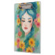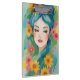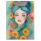 Ce design dynamique et fantaisiste présente un portrait abstrait d'une femme aux cheveux bleus turquoises ornés de fleurs colorées. Son expression sereine est accentuée par les yeux fermés et les lèvres rouges, lui donnant un aspect onirique. Elle est entourée de tournesols vibrants, de fleurs roses et d'un éventail de feuillages verts, créant une atmosphère luxuriante et de jardin. La pièce a un style doux et vectoriel, qui lui donne une sensation moderne mais romantique. La palette de couleurs est dominée par les teals, les jaunes, les roses et les verts, créant une composition harmonieuse et attrayante. Personnalisez avec les initiales.