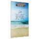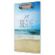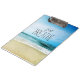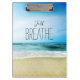Belle plage de sable, vagues bleues et ciel vaporeux avec les mots "juste respirer". Paradis !