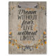 Style typographie motivationnelle citation "Rêver sans peur, Vivre sans limites", éléments floraux sur le bois arrière - plan