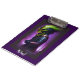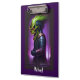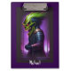 A cartoon demon head with green hair, sharp teeth, and red eyes on a purple and black background creates an awesome clipboard for any heavy metal fan.