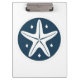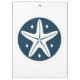 An illustration of a starfish surrounded by white stars in a black circle. Black and white illustration.
