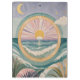 This vibrant, illustrative piece combines nautical scenery with mystical celestial symbols. At its center, a large circular window frames a tranquil sunrise or sunset over rolling ocean waves, rendered in a soothing palette of teal, seafoam, and lavender. Outside this frame, lush tropical foliage and palm fronds anchor the foreground, while the upper sky transition into a twilight scene featuring a golden crescent moon and shimmering stars. The artwork utilizes a mix of flat graphic shapes and soft watercolor textures, creating a peaceful, dreamlike coastal atmosphere that feels both modern and mythical.