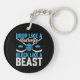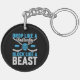 Porte - clé de gardien de hockey avec texte bleu et blanc, casque avec masque, rondelles et bâtons de hockey dit Drop Like a Butterfly Block Like a Beast!