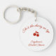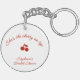 Ce porte-clés en acrylique personnalisé « She's the Cherry on Top » allie charme ludique et praticité quotidienne. Un lettrage rouge gras est placé en haut, associé à une paire joyeuse de cerises dessinées à la main en dessous, tandis qu'un petit espace permet une personnalisation avec le nom de la mariée, la date de l'événement ou un court message. La disposition claire rouge sur blanc conserve l'esthétique fantaisiste et rétro de la collection, ce qui en fait un cadeau amusant, élégant et mémorable. Parfait pour les douches de mariée, les enterrements de vie de jeune fille ou les célébrations sur le thème des cerises, ce porte-clés est un souvenir mignon que les invités garderont longtemps après l'événement.