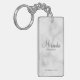 Ajoutez une touche personnelle à votre mariage avec un porte - clé de femme de chambre personnalisé. Ce porte - clé présente le nom personnalisé de la servante de pont dans le style de police de script moderne gris avec titre et date mariage en gris moderne sans serif style de police sur l'arrière - plan en marbre blanc. Parfait aussi pour femme de ménage d'honneur, mère de la mariée et plus. Remarque : Les détails du marbre sont simulés dans l'oeuvre. Il n'y aura pas de marbre sur ce produit.