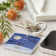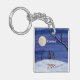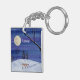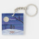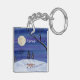 Un tableau aquarelle d'un renard rouge qui trotte dans la neige sous la pleine lune orne ce porte - clé personnalisable !