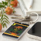 C'est une image d'un Jack-o'-lantern tout habillé. Un citrouille noir avec un casquette aux sorcières orange est assis sur un lit de feuilles verts. La Jack-o'-lantern est éclairée par des yeux brillants et un sourire. Un fond noir a été ajouté pour que vous puissiez voir sa réflexion. Les porte - clés sont disponibles en styles et tailles assortis.