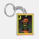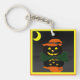 C'est une image d'un Jack-o'-lantern tout habillé. Un citrouille noir avec un casquette aux sorcières orange est assis sur un lit de feuilles verts. La Jack-o'-lantern est éclairée par des yeux brillants et un sourire. Un fond noir a été ajouté pour que vous puissiez voir sa réflexion. Les porte - clés sont disponibles en styles et tailles assortis.