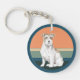 Ce porte - clé présente le portrait d'un adorable petit chien marron et blanc Jack Russell Terrier. L'image est placée sur un corail rétro, légèrement en détresse et arrière - plan de coucher de soleil bleu. L'image est encadrée en bleu assorti. Le dos a le même arrière - plan bleu avec votre texte dans deux champs.