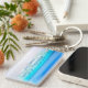 Scène de plage paradisiaque avec principalement des couleurs bleu et aqua. Le nom et le titre sont facilement changés en votre propre Un porte - clé d'entreprise personnalisé Partie d'une gamme de bureaux stationnaires de Chessie's Fine Designs.