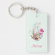 Porte - clé personnalisé avec une jolie aquarelle illustration d'un oeuf assis à l'intérieur d'un panier en osier. Décoré de rubans, arcs, fleurs et petits coeurs aussi. Un flamant rose et un lapin lapin blanc se tiennent de part et d'autre en regardant la cargaison précieuse.