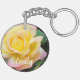 Une photo originale d'un rose de la Paix poussant dans mon jardin. Il a des pétales doux, jaune doré et rose avec des feuilles verts profonds. Il y a des gouttelettes d'eau provenant de pluies récentes. Elle symbolise la paix, ce qui en fait l'une de mes fleurs préférées. Montré ici sur un porte - clé acrylique à deux côtés. Personnalisez-le avec un nom ou un message si vous aimez pour vous-même ou comme un cadeau. Le texte sera automatiquement mis à jour à l'envers. Belle façon de profiter d'une touche de nature ! Idée cadeau idéale pour les amateurs de roses et de fleurs !