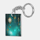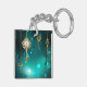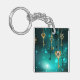 Or, clés antiques avec engrenages et cadrans accrochés sur chaînes dorées sur arrière - plan vert lumineux.