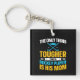Porte - clé à thème de hockey pour la maman de hockey avec des rondelles de hockey et des bâtons avec le texte de blanc, jaune et bleu qui lit La seule chose plus dure qu'un joueur de hockey est Sa maman!