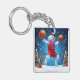 Un bonhomme de neige, planté dans un maillot de Chicago Bulls et beanie, saute à la joie au milieu d'une scène de Noël enneigée. Il jongle avec deux boules de basket, mettant en valeur son esprit de vacances et son amour pour le jeu. Des lumières scintillantes ornent les arbres de Noël de chaque côté, tandis que des ornements colorés et des chutes de neige complètent l'atmosphère festive.