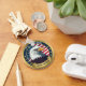 Background: The eagle is superimposed over a circular American flag design with a blue field of stars and red and white stripes.
