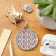 A round keychain featuring a vibrant floral pattern with purple, pink, and green accents. It is displayed on a wooden surface beside keys and a smartphone, evoking a cheerful and elegant vibe.