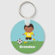 A keychain with a cute African American boy with short cropped hair who is happily playing football. The boy is wearing a yellow jersey, brown shorts and matching colour palette shoes and socks. You can personalize with the child's name and even the jersey number on the design! Great for boys who love soccer or active in the sports!