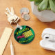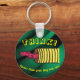 This is a round keychain featuring a dog, running through a tunnel with a green background, and the text, “THINK! Faster Than Your Dog Can Run!”