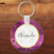 Un porte - clé mongoram au design abstrait élégant. Couleur améthyste violet foncé avec des rubans d'or nichés entre des strates stratifiées. Un design riche et magnifique. En haut, un cadre en cercle blanc avec une fausse bordure en feuille d'or, avec votre texte personnalisé à l'intérieur.