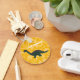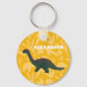 Créez un cadeau personnalisé qui conviendra parfaitement aux amateurs de dinosaures jeunes et vieux. Ce porte - clé présente une photo d'un jouet en plastique apatosaurus dinosaure en vert avec des accents rouges rouille contre un arrière - plan jaune vif avec un motif de fossiles d'empreintes de dinosaures. Ajoutez votre propre nom ou autre texte en caractères gras blancs.