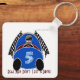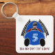 Ce porte - clé présente IconDoC'est la peinture numérique originale d'un bleu vif de style comique, 1920 Bugatti inspiré voiture de course & conducteur avec drapeaux de dames croisés. Par défaut, la légende est "Les vrais hommes ne sattent pas et ne conduisent pas". Gardez, changez ou effacez.