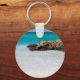 Porte - clé avec une belle photo. Une plage de sable blanc, au surf doux. Une eau tropicale turquoise entoure un rocher déchiqueté.