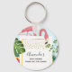 Un baby shower merci porte - clé avec un flamant rose mignon et capricieux. Entouré de feuilles tropicaux verts, de fleurs d'hibiscus rouges et jaunes. Un cadre de dégradé doré en forme de rectangle au centre.