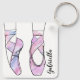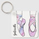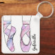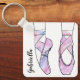 porte - clé carré avec les chaussures de pointe classiques de ballerine dans un imprimé d'aquarelle rose et violet sur les deux côtés. Un cadeau de charme pour danseurs de ballet ou amateurs de ballet, ce design garde l'élégance des chaussures avant et centre. Personnalisez avec un nom pour en faire le vôtre.