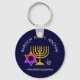 Élégant et élégant HANOUKKA BÉNÉFICIANT Porte - clé. Le design montre un MENORAH couleur or avec l'étoile multicolore de DAVID et gris argenté DREIDEL. En haut il y a le texte courbe qui dit BARUCH ATAH, ADONAI (Béni soit toi, ô Dieu) et en dessous le texte dit HANOUKKA BLESSINGS. TOUT TEXTE EST PERSONNALISABLE, vous pouvez donc personnaliser avec votre propre choix de salutation et de texte. La couleur arrière - plan est bleu nuit. D'autres versions sont disponibles dans la collection HANOUKKA par Berean Designs.