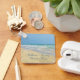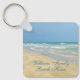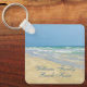 Beautiful beach house keychain with gorgeous seaside photography featuring a pretty sandpiper standing at the edge of the ocean waves on a sunny summer day. Lovely blue green water waves roll onto the sandy shore where your name is personalized in cute blue typography. A beautiful tropical island home gift.