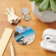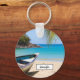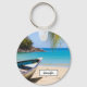 Un porte - clé personnalisé avec une scène de plage tropicale idyllique. Eau cristalline bleu turquoise et plage de sable brun doux. Des feuilles de palmiers accrochés au-dessus. Un vieux bateau à rames en bois est installé sur la plage. Un paysage serein et paisible.