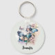 Porte - clé personnalisé avec un trio de papillons flottant parmi de jolies fleurs. Couleurs bleu rose et vert.