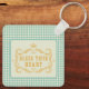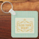 Porte - clé amusant avec une touche de charme du Sud, avec l'or texte "bénis ton coeur" dans cadre chic et vintage bleu en vichy arrière - plan.