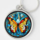 Sur ce porte - clé unique se trouve l'image d'un beau papillon orange et or contre un arrière - plan de style vitrail. L'arrière - plan et la frontière sont dans les tons bleus. Élégant, lumineux et coloré ! Assurez-vous de voir les boucles d'oreilles et le collier correspondants dans notre magasin.
