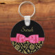 Porte-clés Black Gold Floral Damask Bow rose et nom chic