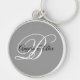Wedding anniversary elegant premium keychain with a minimalist couple's monogram in a fancy calligraphy script in black and white against solid gray.