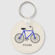 A keychain featuring an illustration of a blue bicycle. Personalize with your name under bike.