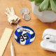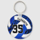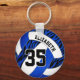 This sporty girl's volleyball keychain features a wild zebra stripes accent pattern on four of the volleyball's panels - the zebra stripes panels have a blue background that contrasts with the remaining solid white volleyball panels - customize with player name and jersey number - by katz_d_zynes