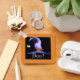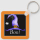 Fun Halloween porte - clé présente l'aquarelle illustration d'un casquette sorcier violet avec araignée pendante et blanc personnalisable texte "Boo!" sur arrière - plan noir