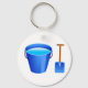 Illustration d'un seau de plage bleu vif rempli d'eau et d'un pique assorti pour les vacances d'été. Customisez facilement et choisissez votre propre couleur arrière - plan. Image disponible sur divers cadeaux et produits.