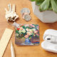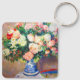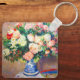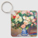 Porte - clé avec la peinture à l’huile Bouquet de Chrysanthèmes de Pierre-Auguste Renoir et un ventilateur japonais (1880). De belles fleurs rouges et blanches sont disposées dans un vase bleu et blanc. Un ventilateur coloré se trouve à proximité. Un cadeau intimiste pour les collectionneurs de fleurs classiques et les amateurs d'art français !
