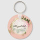 Une porte - clé avec un bouquet de rose fleuri aux fleurs blanches et roses. Arrière - plan est rose avec un motif fleuri. Joli et élégant design. Un cercle blanc semi-transparent superposé avec une fausse bordure en feuille d'or. Personnalisez avec un nom.
