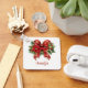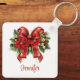 Porte - clé personnalisé avec un arc de Noël festif en rouge et or. Entourée de fleurs de poinsettia, de décorations de pin et de Noël.