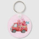 Porte - clé avec un joli camion couleur rouge. Portant des coeurs et des fleurs à l'arrière. Je t'aime, écrit sur le côté. Whimsical et adorable. Arrière - plan à motif rose clair.