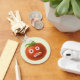 Un porte - clé de tomate drôle avec une illustration d'un personnage de tomate bizarre avec la langue coincée et un regard perplexe dans les yeux.