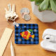 Illustration d'un poisson tropical jaune orange de noël sous l'océan avec des bulles sur un arrière - plan motif bleu noir à damiers buffle. Ce dessin animé mignon est une idée cadeau pour les amateurs de xmas, de pêche et de snorkeling.